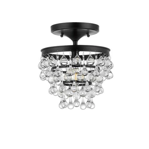 The semi-flush mount fixture features a matte black finish with glass crystal drops. It is a stylish option to update your lighting environment and will add a touch of class wherever you mount it.