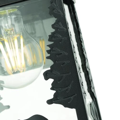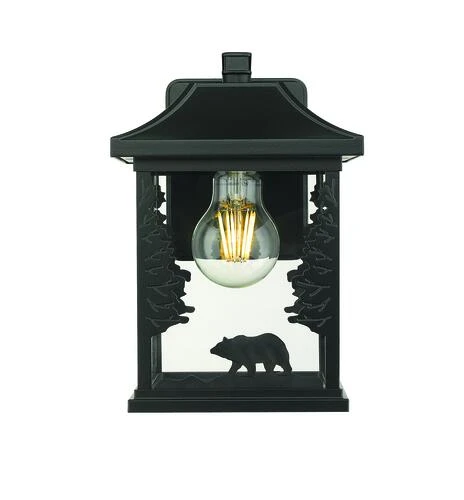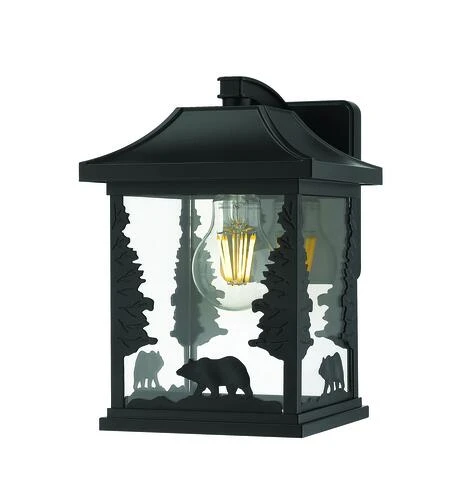 Capture the majestic spirit of the wilderness with the Bear outdoor wall lantern by Patriot Lighting®. Three charming, ambling bear silhouettes circle the square glass lantern shade with tall, sturdy trees bracing the corners, all crafted in durable powder coated black aluminum. A single bulb perfectly lights the arts and crafts inspired rustic scene, creating lodge or cabin ambiance for any front porch or garden.