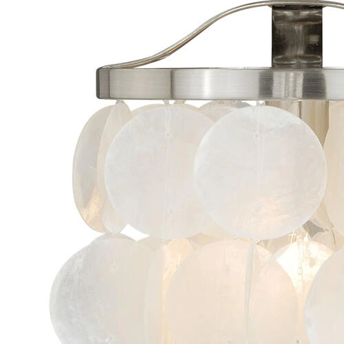 Soft contemporary styling combined with texture and iridescence. The Elsa collection mini-pendant is a unique option to lighten and liven up the space above your kitchen island or bar area. Tiers of hand-strung natural Capiz shells create a soft diffused light that perfectly compliments the satin nickel metal elements. This is a full collection with coordinating pieces to decorate any room in the house. Features candelabra lamping; frosted bulb recommended for best appearance.