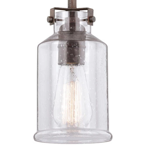 This rustic inspired soft industrial loft collection called Milone produces a bold statement. The textured rust finish together with the clear seeded jar glass are artistically combined to create an ageless appeal with a modern twist. Combine that with a vintage Edison style filament bulb to complete the look. It blends well with transitional, farmhouse, cottage, and loft interiors. Install this mini pendant individually or in a group; ideal for kitchens, dining areas, or bar areas.