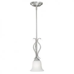 The Patriot Lighting® Samantha 6″ mini pendant features the delicate scroll arm design in satin nickel finish and etched white bell shaped glass. Perfect for almost any room in the home from bedrooms and living rooms to hallways and kitchens.