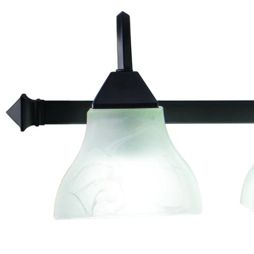 The Cardiff vanity collection features an oil burnished bronze finish with square white alabaster glass shades. The linear details, square shades, and simple form are reminiscent of an updated Mission style.