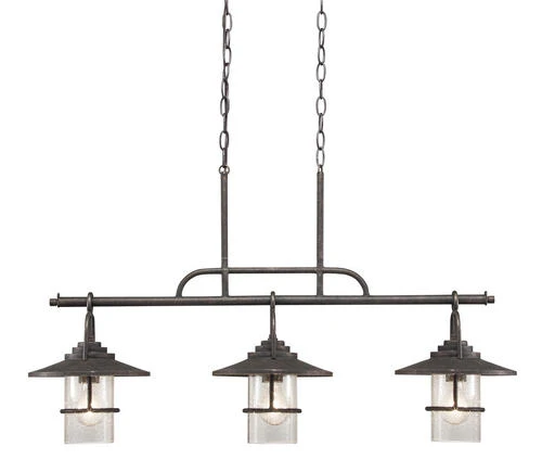 This Miner 36″ 3-Light Island Pendant Light in Bronze is beautifully crafted from durable metal and appointed with clear seeded glass. This island pendant light includes the mounting hardware and installation instructions. This light fixture requires (3) 60 watt medium base bulbs (not included).