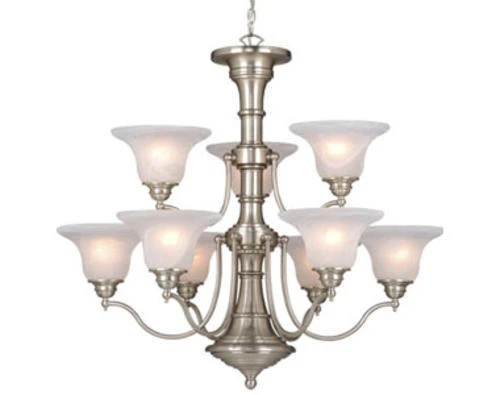 Patriot Lighting® Standford nine-light chandelier has contemporary elements as well as traditional elements to make this piece truly ideal. The brushed nickel finish and alabaster glass fits perfectly with your style. This chandelier works great in any room including foyers, living spaces or dining areas. Once you introduce this in your home, you’ll love the way it fits in.