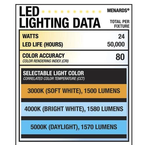 - This LED light has a CRI of 80, can choose from 3000K(Soft white), 4000K(Bright white), 5000K(Day light) color temperature, and is 1580 lumens