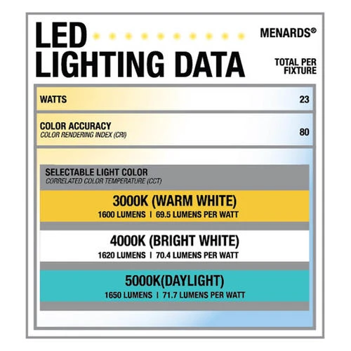 - This LED light has a CRI of 80, (3) color temperatures of 3,000K (warm white), 4,000K (bright white), and 5,000K (daylight), and is 1,600 lumens