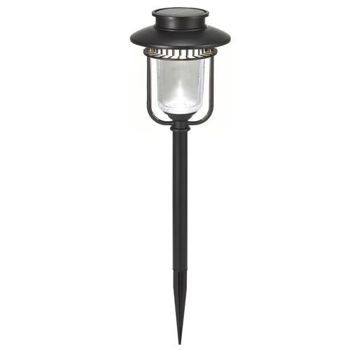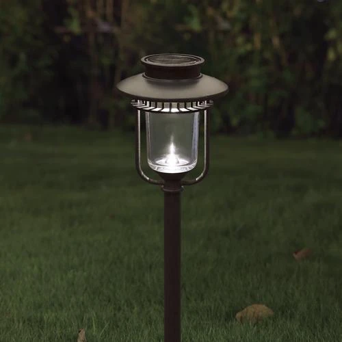 This Patriot Lighting Leighton Solar Integrated LED Landscape Light features a crystalline solar panel and a stainless steel construction with a glass lens. It has an LED brightness of eight lumens, is built in a AA size, and contains a 600mAh Ni-MH rechargeable battery.