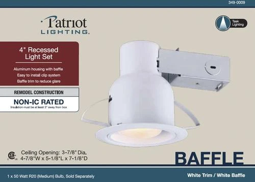 This Patriot Lighting® 4″ white recessed remodel light set is non-IC rated.