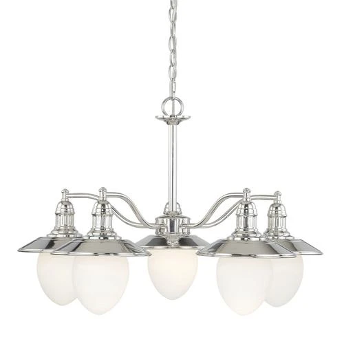 Patriot Lighting® Marina Bay 5-light chandelier brings a subtle touch to your home. The polished nickel finish and frosted opal glass blend flawlessly to create a breezy atmosphere and welcoming touch. This trendy yet simple design can add flare to your existing décor with very little effort.