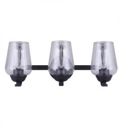 Build your style piece by piece with the addition of the Kari three-light vanity light. The simplicity of this light stands out with its clean lines, trendy matte black finish, and beautiful seeded glass shades that mesh perfectly with the whole transitional style of this fixture. By placing this light over your bathroom mirror, Kari is sure to shine the perfect light over you and your family.