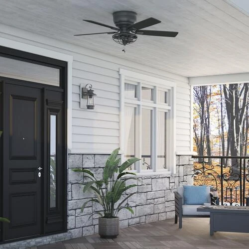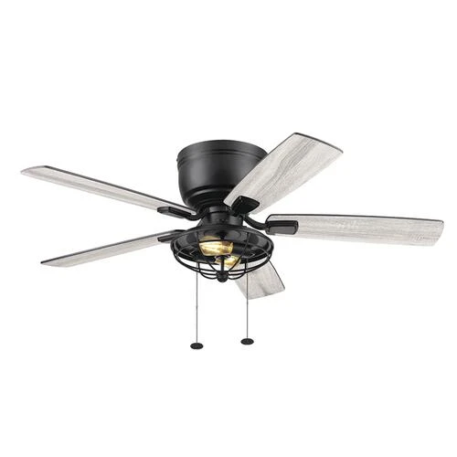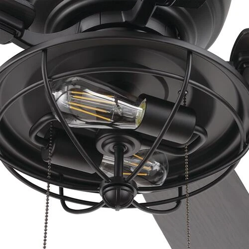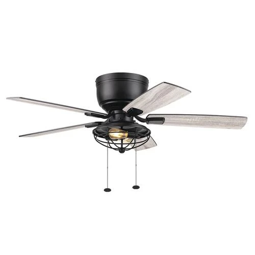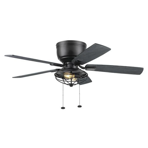 Patriot Lighting presents the 52 inch matte black Annetta hugger ceiling fan with reversible blades and metal cage. The Annetta fan has an indistrial design ideal for your large rooms indoors or on a covered porch. Two LED medium based clear bulbs provide adequate lighting for most applications for rooms with lower ceilings.