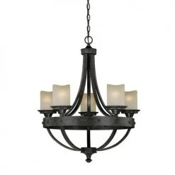 The lancaster 5 light chandelier features a formal yet rustic design in a black walnut finish with a creme cognac glass. This unique shape with thick metal detailing provides a striking look when incorporated into traditional interiors. This chandlier will add style and brightness to your dining or living areas.