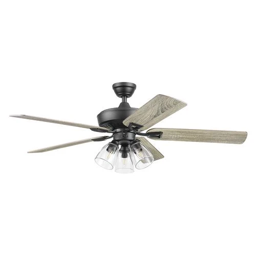 Patriot Lighting presents the 52 inch matte black Madeline ceiling fan with reversible blades and 3 clear glass shadesl. The Madeline 3 light fan has a transitional design ideal for your medium to large rooms. Three LED medium based clear bulbs provide adequate lighting for most rooms and the remote control makes it easy to control from anywhere in the room.