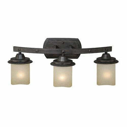 The Lancaster three-light vanity features a formal yet rustic design in a black walnut finish with a creme cognac glass. This unique shape with thick metal detailing provides a striking look when incorporated into traditional interiors. This vanity will add style and brightness to your bath or hallways.