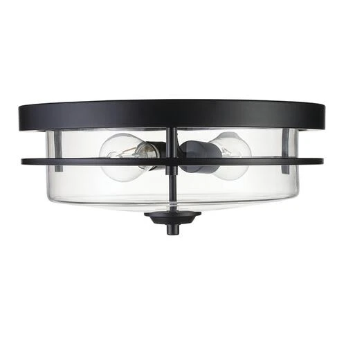 The Joska flush mount light has an enhanced style to upgrade any room. This two-light flush mount fixture has a transitional, matte black finish and a clear glass diffuser.